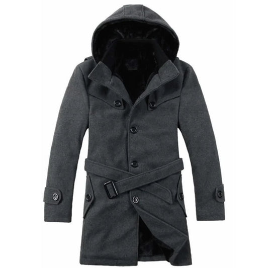 Heren Trenchcoat met Capuchon – Wolmix, Imitatiebont Gevoerd, Enkelrijig Design